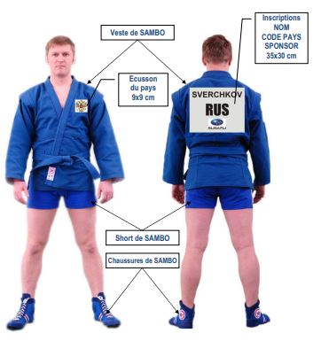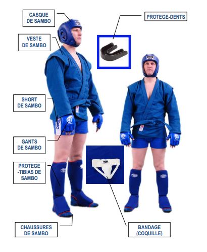 Pour le samboïste de combat, s’ajoutent un casque, des gants, un protège-dents, une coquille, et un protège-poitrine pour les femmes.