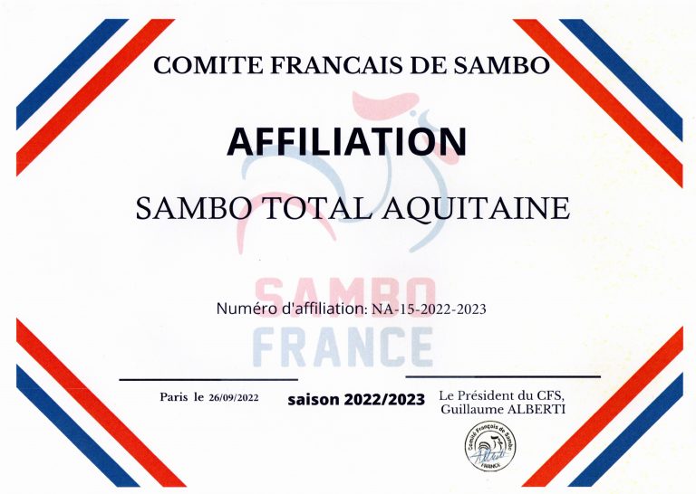 TOTAL SAMBO AQUITAINE est une association affiliée à SAMBOFRANCE, représentant des acteurs du Sambo en France.